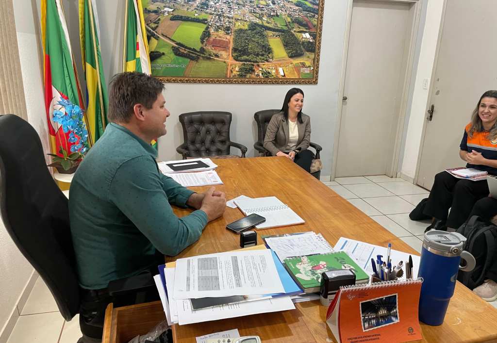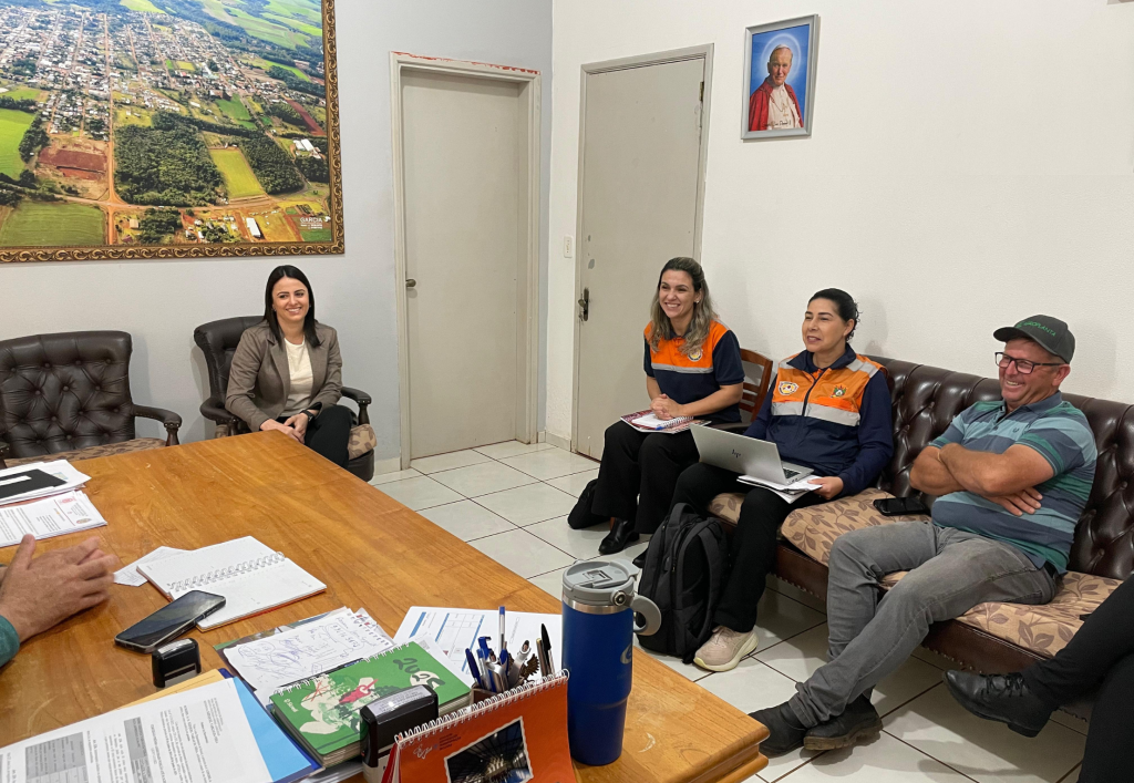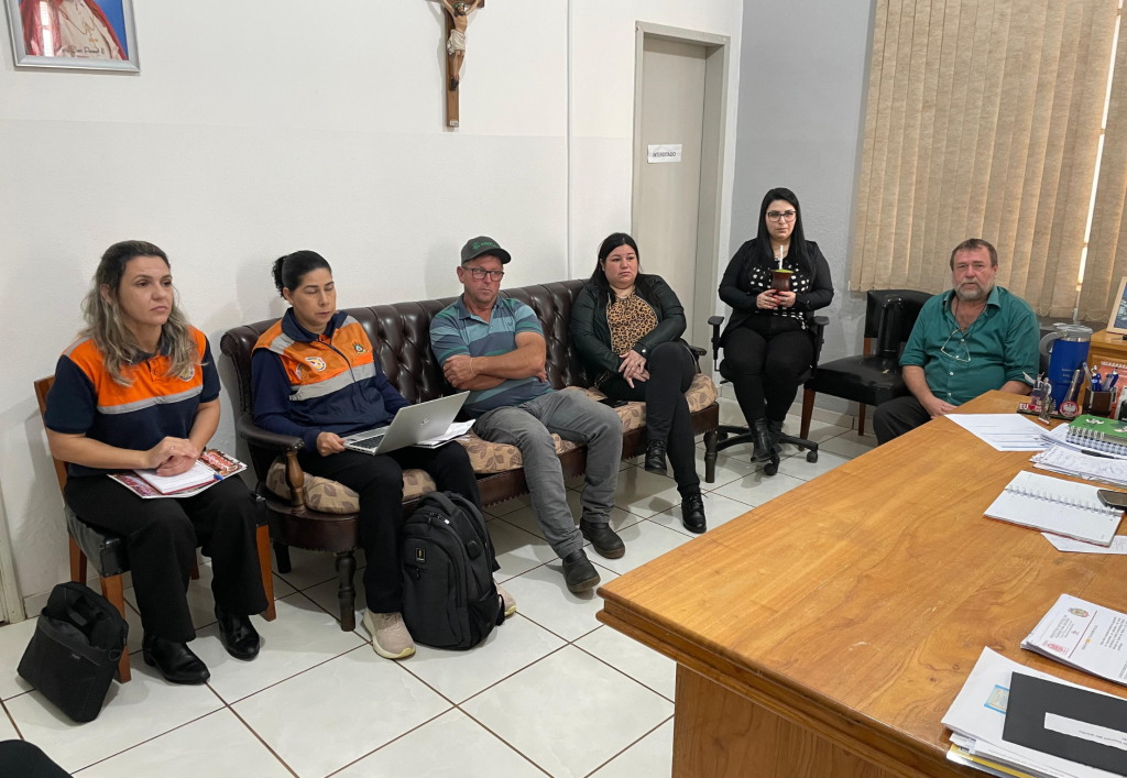 Reunião presencial no gabinete do prefeito de Guarani das Missões, reunindo os membros da CREPDEC-5 Santo Ângelo: Sgt. Chagas e a Servidora Civil Cristiane, juntamente com os representantes do município.