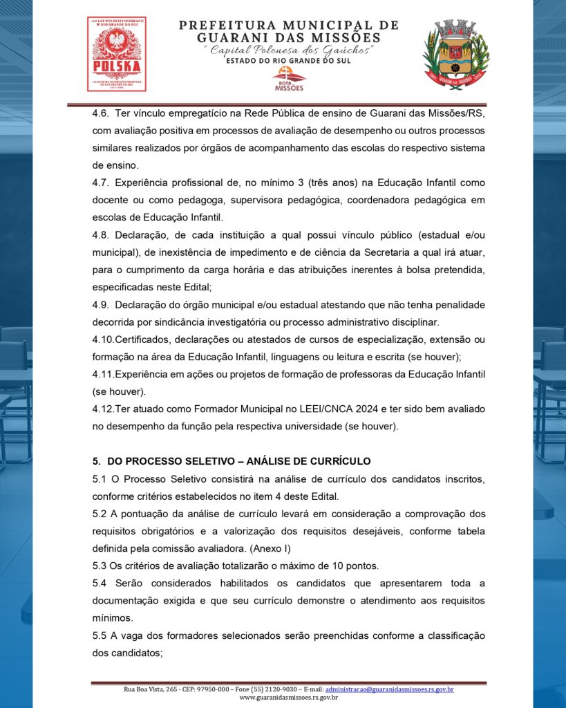 O PREFEITO MUNICIPAL DE GUARANI DAS MISSÕES/RS, no uso de suas atribuições, e em conformidade com o Programa de Apoio à Leitura e Escrita/Compromisso Nacional Criança Alfabetizada (Pro-LEEI/CNCA), Portaria MEC Nº 85, de 31 de janeiro de 2025, torna público o presente Edital de Processo Seletivo Simplificado para preenchimento de 01 (uma) vaga de Formador Local do Pro-LEEI, e formação de Cadastro Reserva, para atuação no Município de Guarani das Missões/RS, por meio de análise de currículo.