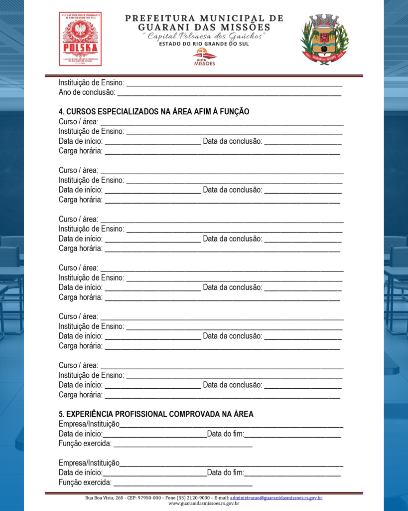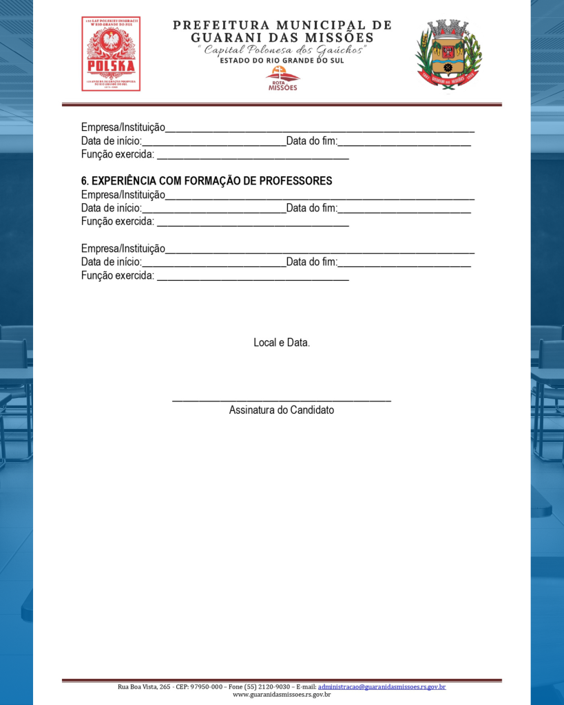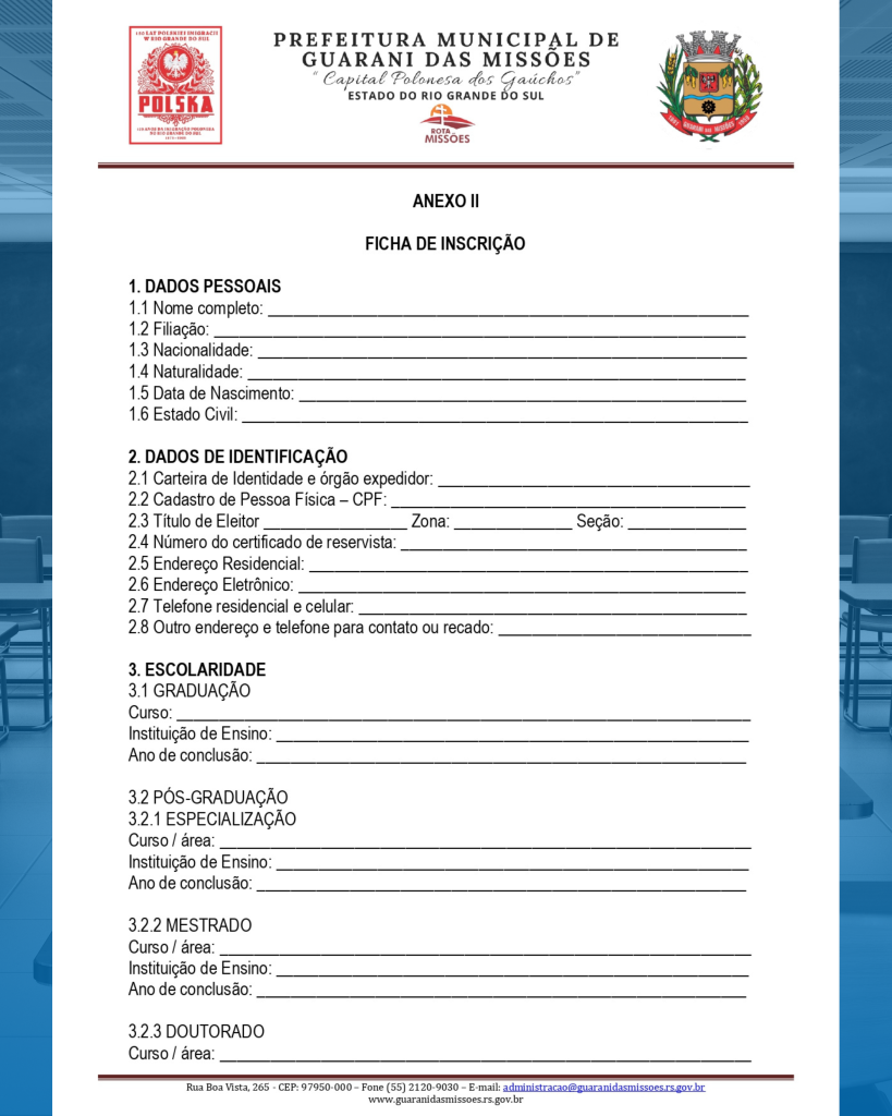 3.1. Período de Inscrições: As inscrições estarão abertas e deverão ser realizadas presencialmente na Secretaria Municipal de Educação, sito à Rua Giruá, nº 190, Bairro Centro, Guarani das Missões/RS, do dia 10 de outubro de 2025 até o dia 17 de outubro de 2025, das 08h às 11h30 e das 13h30min às 17h00;