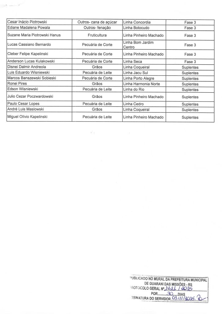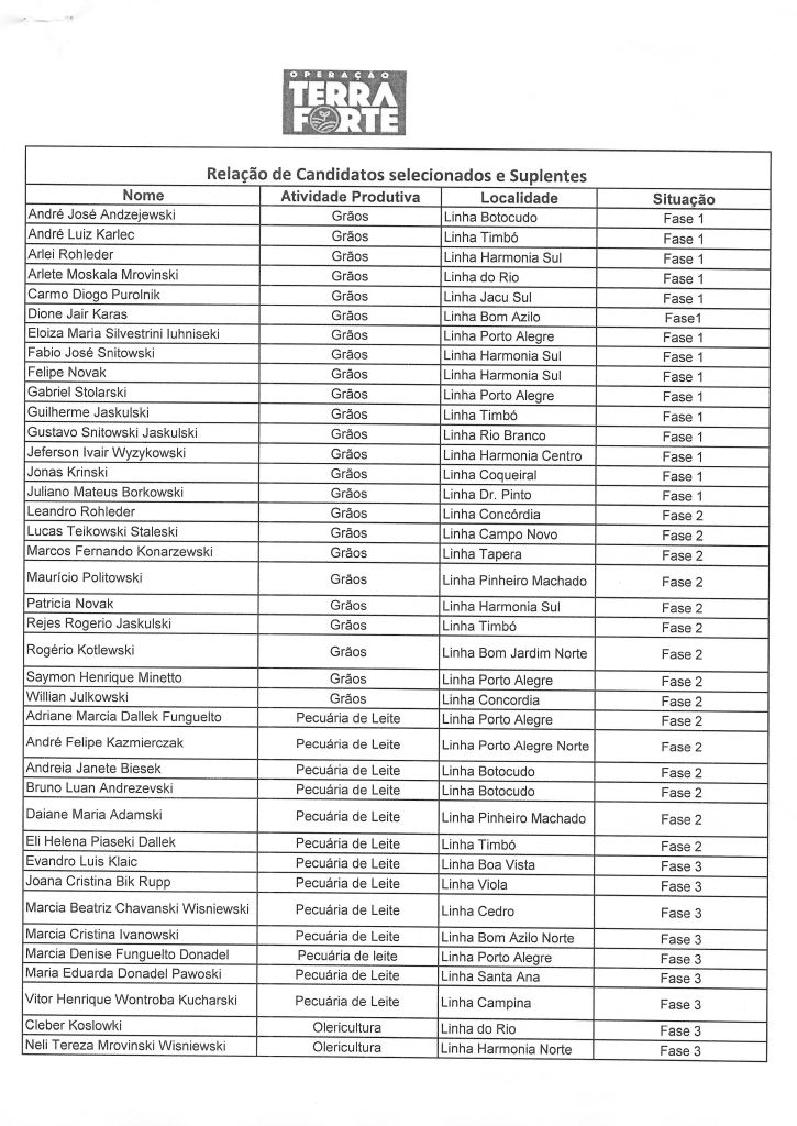 A Administração Municipal, por meio da Emater e Secretaria de Agricultura, divulga a relação de candidatos selecionados e suplentes da Operação Terra Forte.