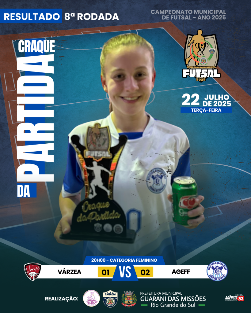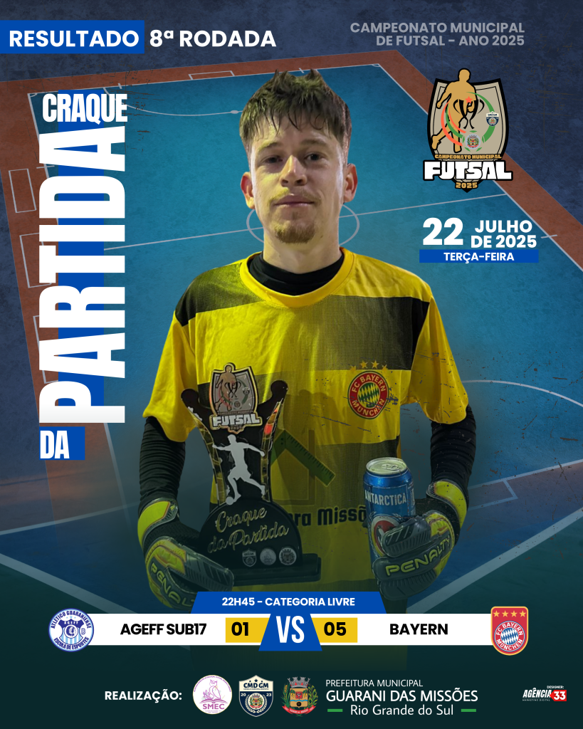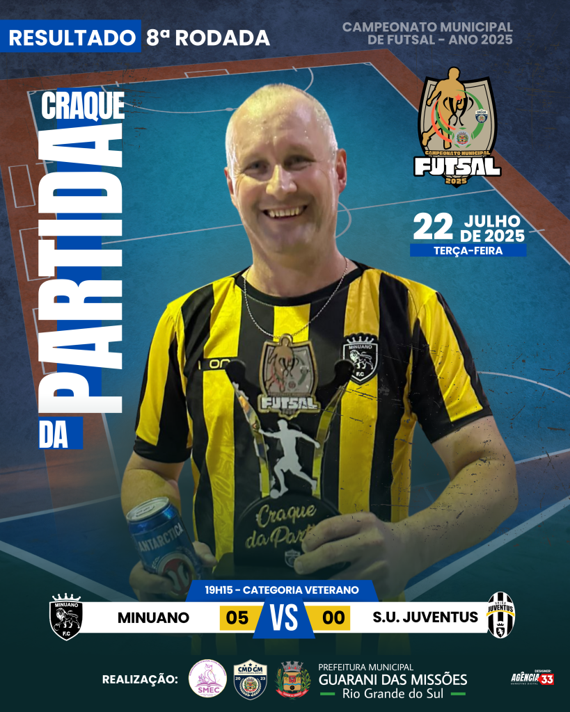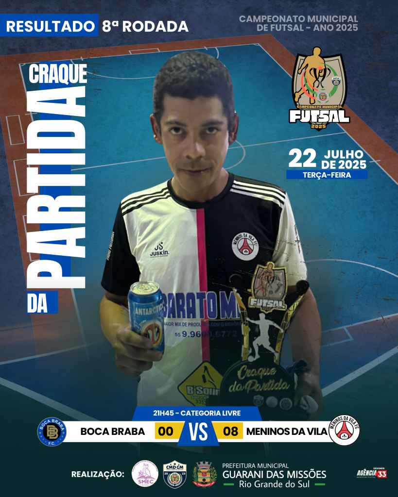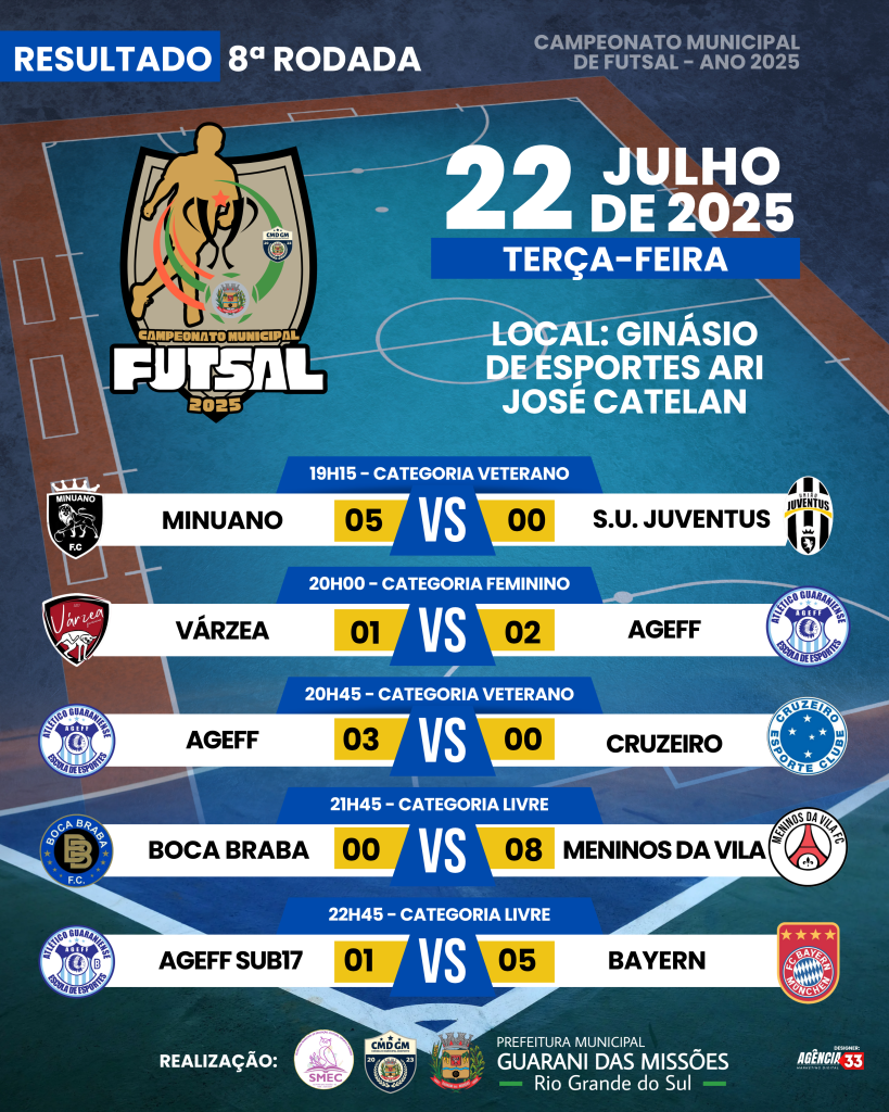 No dia 22 de JULHO de 2025 (quinta-feira), foi realizado a 8ª rodada do Campeonato Municipal de Futsal – ano 2025, a mesma foi realizada no Ginásio de Esportes Ari José Catelan.