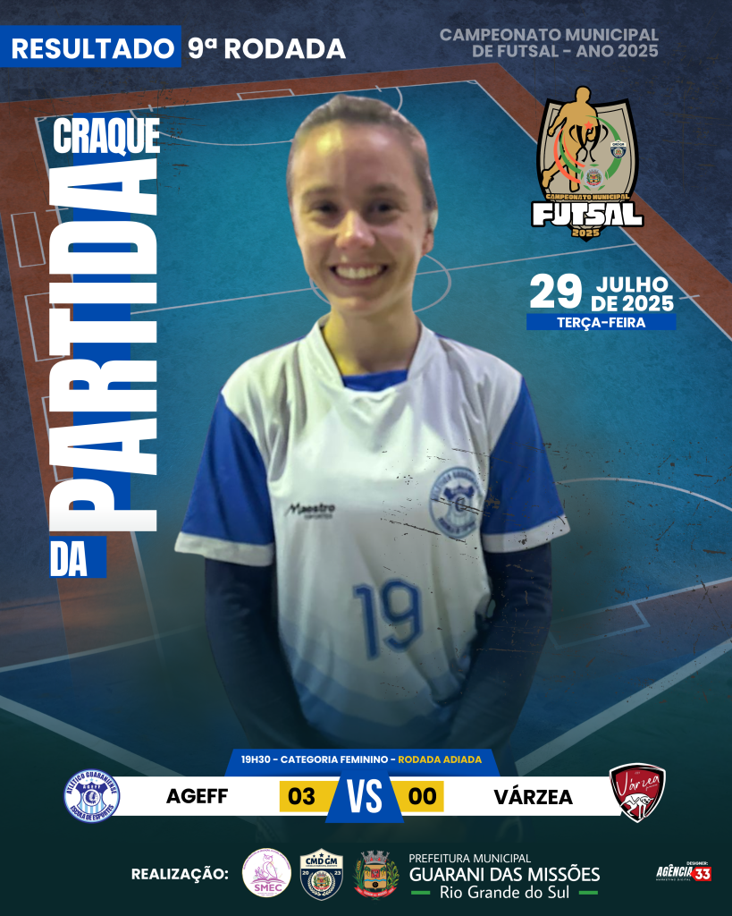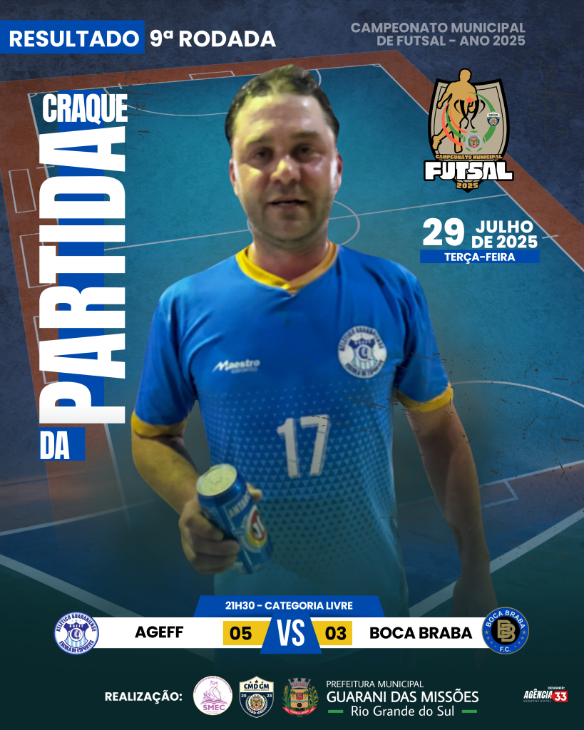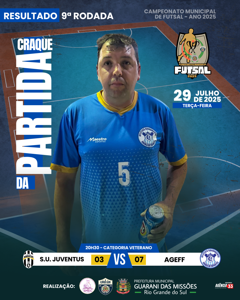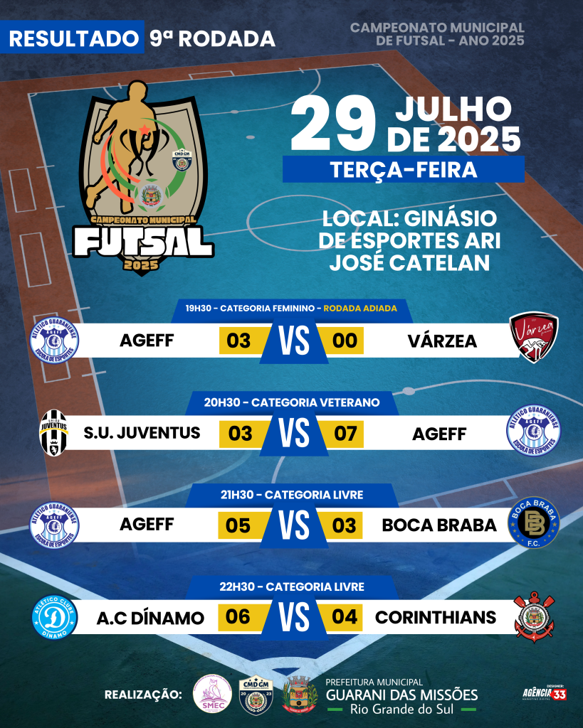 No dia 29 de JULHO de 2025 (quinta-feira), foi realizado a 9ª rodada do Campeonato Municipal de Futsal – ano 2025, a mesma foi realizada no Ginásio de Esportes Ari José Catelan.