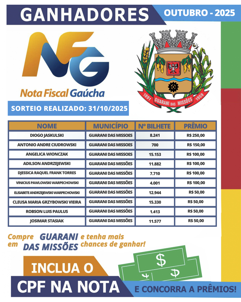 Mensalmente, são DEZ sorteados em nível municipal. Para concorrer, basta ter cadastro no Programa Nota Fiscal Gaúcha e inserir o CPF nas notas na hora das compras, que deverão ser realizadas no comércio local. Faça seu cadastro e exija a colocação do seu CPF!