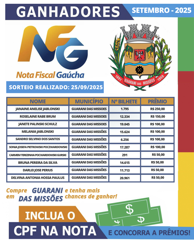Confira os ganhadores do sorteio referente ao mês de SETEMBRO de 2025: Sorteio NFG 156 – SETEMBRO de 2025